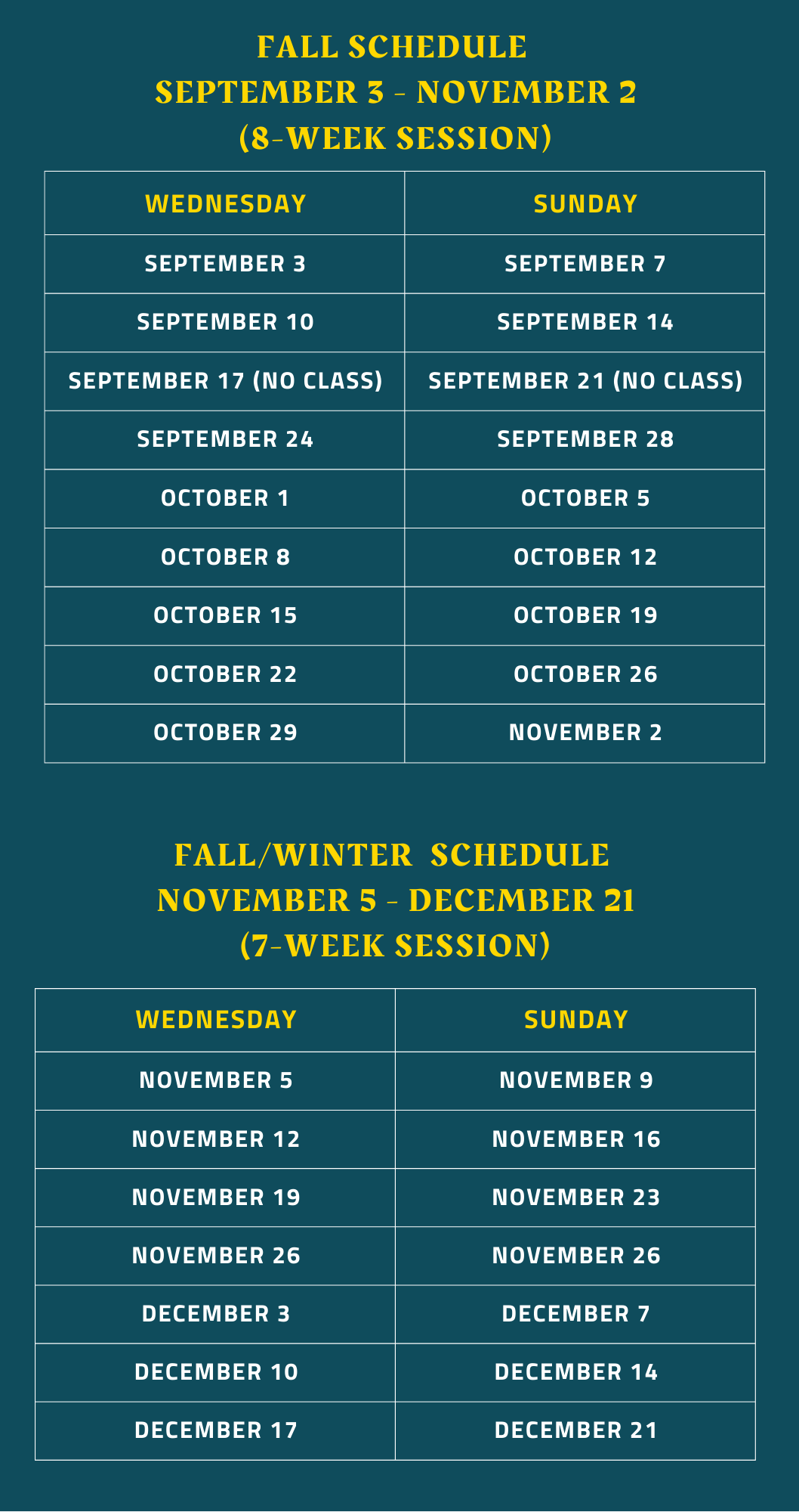 Fall session (September 3 to November 2) - 8-week session (one class per week) = $144 (Please pay via e-transfer)